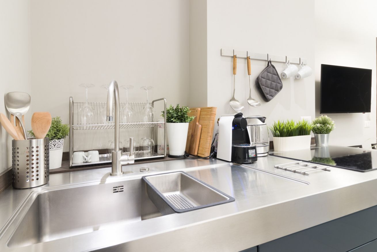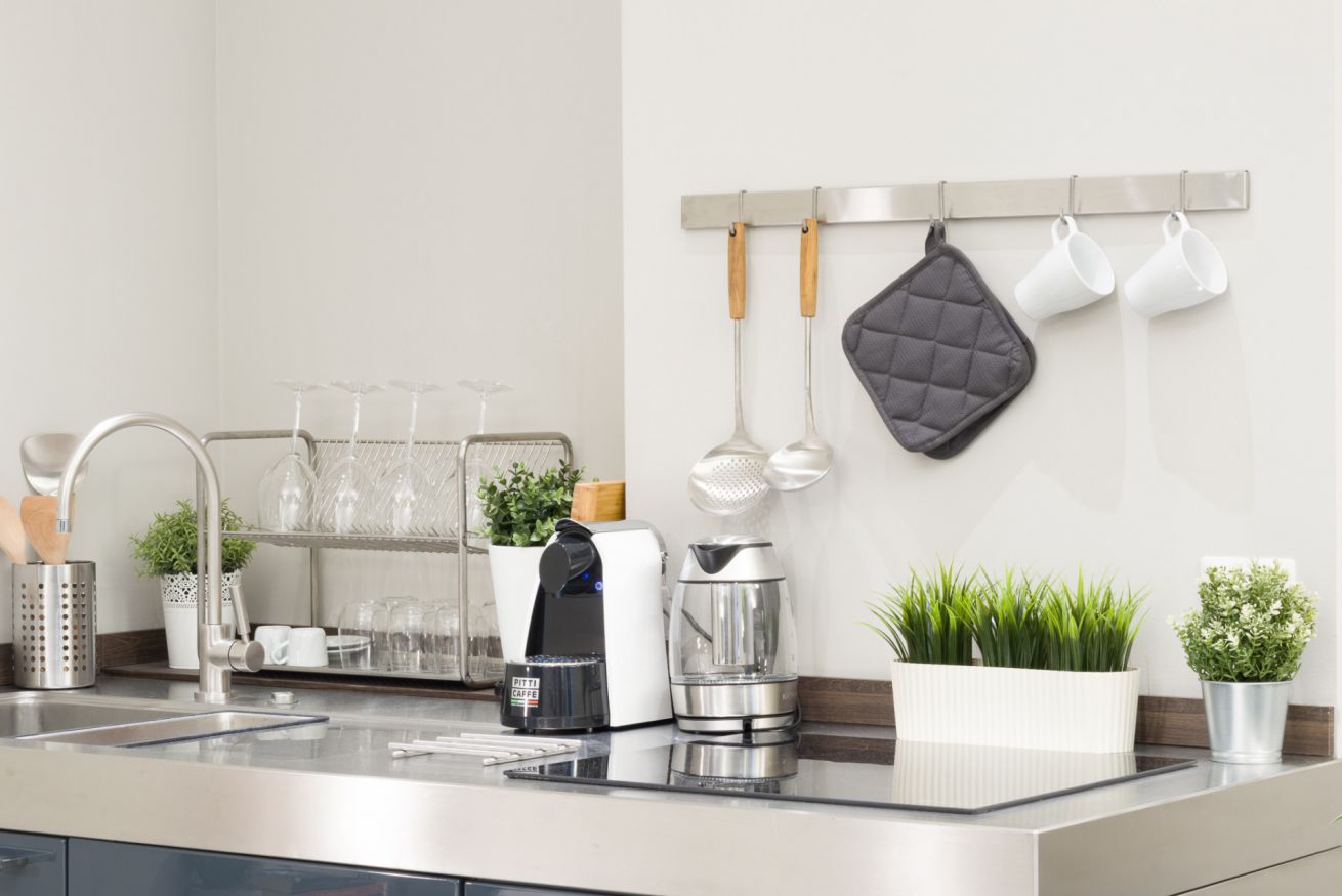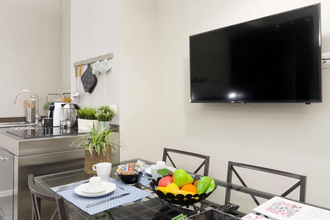 The entrance opens onto a single, welcoming room with living/sleeping area and bathroom. The modern kitchen is fully equipped, the bed offers a comfortable space, while the bathroom is large and well-stocked, with a courtesy kit (shampoo/shower gel) and a hairdryer available.